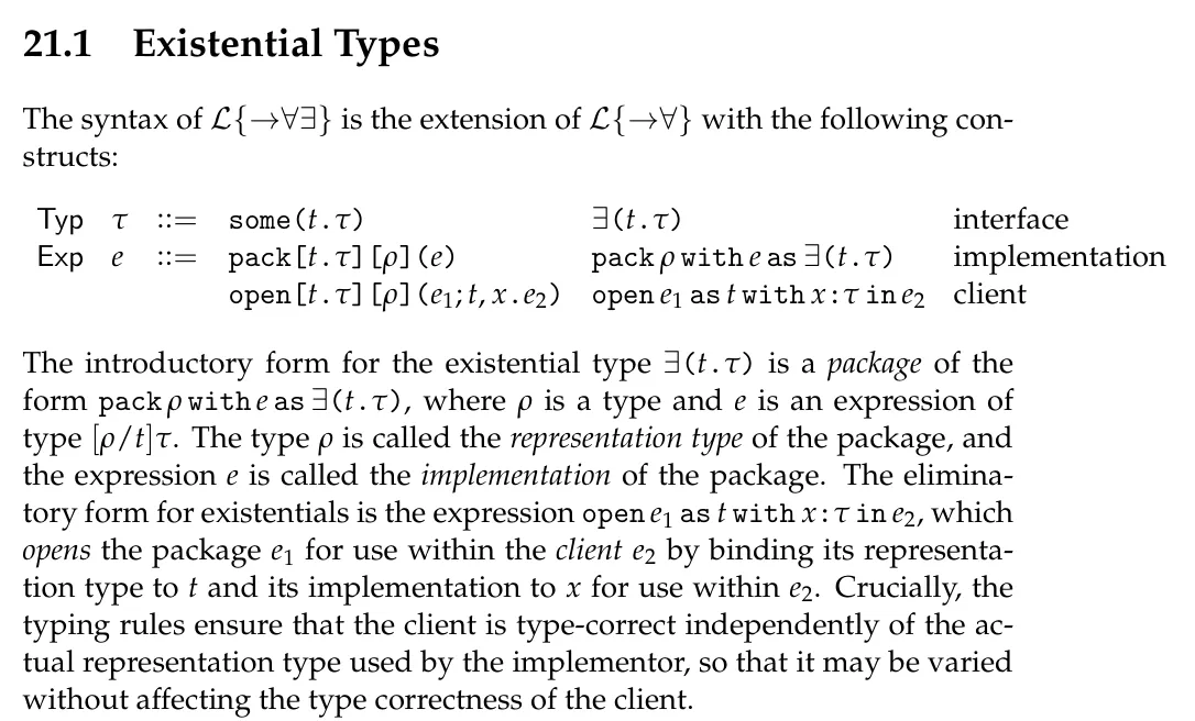 据说 existential type 在 rust 里的对应是 dyn Trait —— 你不知道具体是什么类型 但是保证了这里存在一个类型 T 满足 Trait. 或者说,存在类型对应一个 trait 而它的一个实例对应一个 impl